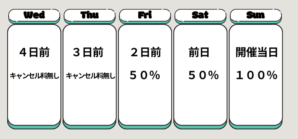 レッスンは2日前〜開催当日になりますとキャンセル料をいただきますのでご了承ください。
