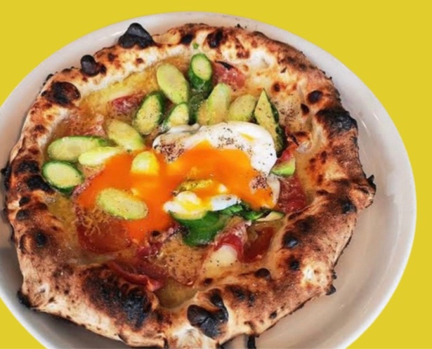 スモークチキンと半熟卵とアスパラのビスマルクピッツァ